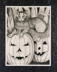 Halloween, Cat & Pumpkins 18"x24" Print: $125